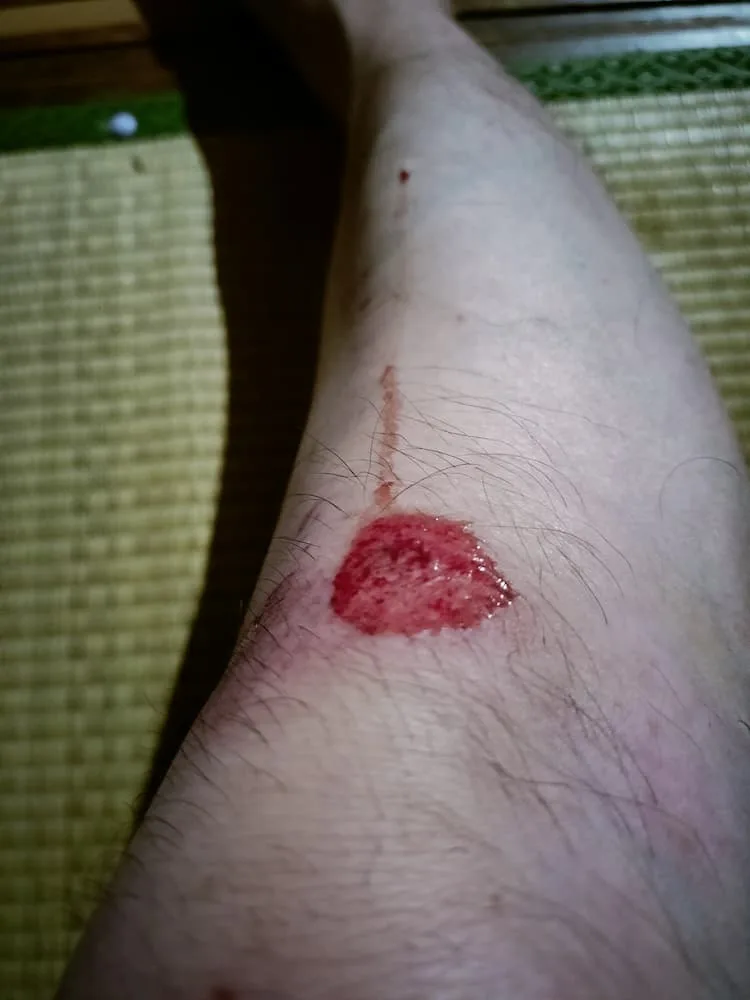 膝を劇打して擦りむいてこの通りの有様です。自転車の立ちこぎはもうしません!と反省の朝でした。ズボンは当然破れたのですが、このまま定期講習に向かいました。お恥ずかしい話です…